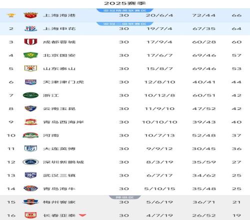 北京时间11月22日,随着最后一轮联赛8场同时开赛的比赛顺利进行,2025赛季中超联赛就此结束。30轮完整积分榜,上海海港领先上海申花2分,以绝对优势实现联赛三连冠。保级方面保级线降至25分,青岛海牛锁定最后一个保级名额,梅州客家成为长春亚泰之后第二支降级球队。